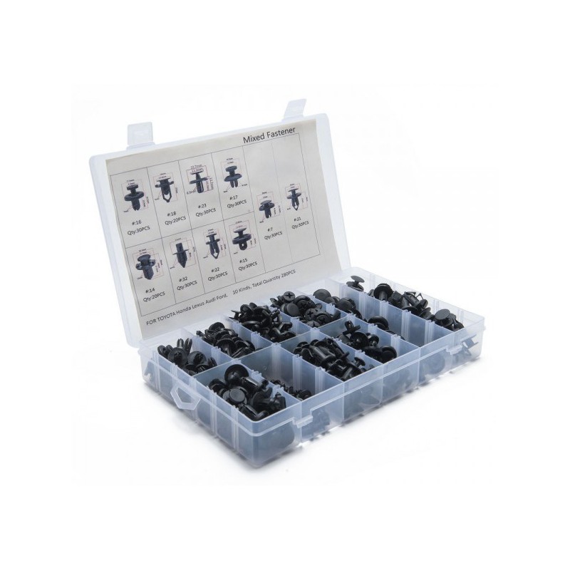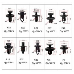 Zestaw uniwersalnych spinek / klipsów montażowych.