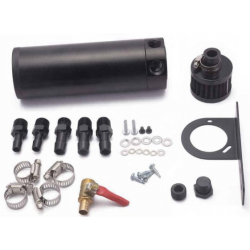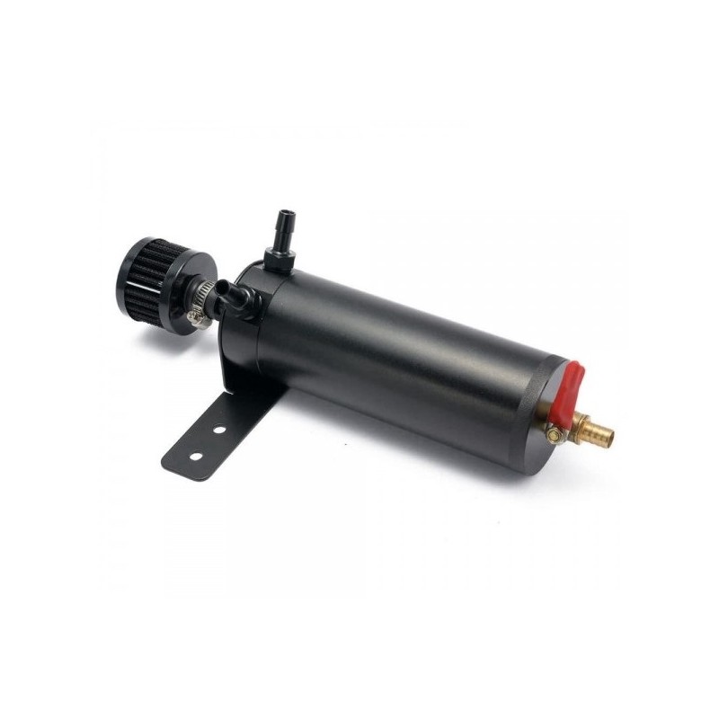 Uniwersalny Oil catch tank z uchwytem montażowym do komory silnika. Skutecznie oddziela olej od powietrza w układzie PCV/CCV, chroniąc dolot i zawory przed zanieczyszczeniami. Wykonany z aluminium 6061, spawany metodą TIG, wyposażony w zawór spustowy i trwałe, matowe wykończenie.