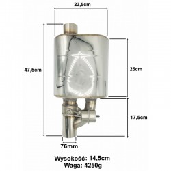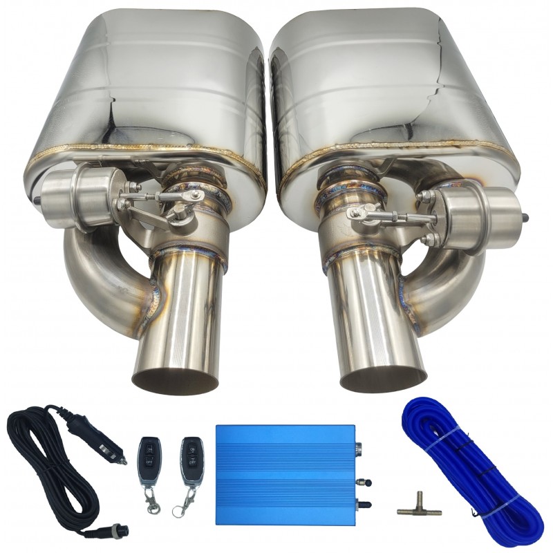 Wysokiej jakości tłumiki przelotowe, wykonane w 100% ze stali nierdzewnej firmy EPMAN. Wyposażone w pneumatyczną przepustnicę sterowaną podciśnieniem, dzięki czemu możemy sterować głośnością auta w dowolnym momencie + sterownik elektryczny (pompa podciśnienia) z bezprzewodowymi pilotami oraz całym zestawem montażowym widocznym na zdjęciach.