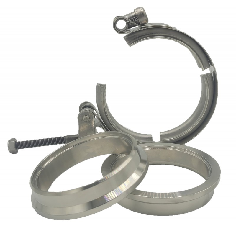 Obejma V-Band z flanszami centrującymi typu żeńska/męska, zaprojektowana z myślą o precyzyjnym i szybkim montażu w układach wydechowych oraz turbo.